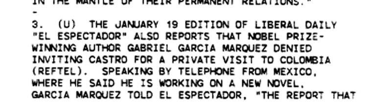 Y entonces recoge el documento el interés de la entidad estadounidense en el ya Premio Nobel colombiano Gabriel García Márquez, a quien citan en diálogo con medios nacionales desde México negando que él hubiera invitado a Castro a una visita privada a Colombia: 'La noticia de que yo invité al presidente Fidel Castro, cualquiera que sea su fuente, carece de seriedad. Fidel Castro es un jefe de Estado y, como tal, solo puede ser invitado a Colombia por el jefe de Estado colombiano. Todavía no estoy tan loco como para arrogarme el derecho el derecho que le pertenece al presidente Betancur'