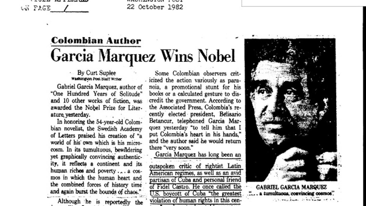 En un artículo del Washington Post, titulado ‘García Márquez wins Nobel’, publicado el 22 de octubre de 1982, el investigador de la CIA subraya el párrafo que dice: 'García Márquez ha sido desde hace mucho tiempo un abierto crítico de los regímenes derechistas latinoamericanos, tanto como ha sido un ávido partidario de Cuba y amigo personal de Fidel Castro. Una vez llamó al boicot de Estados Unidos a Cuba ‘la mayor violación de los derechos humanos en este siglo’'.