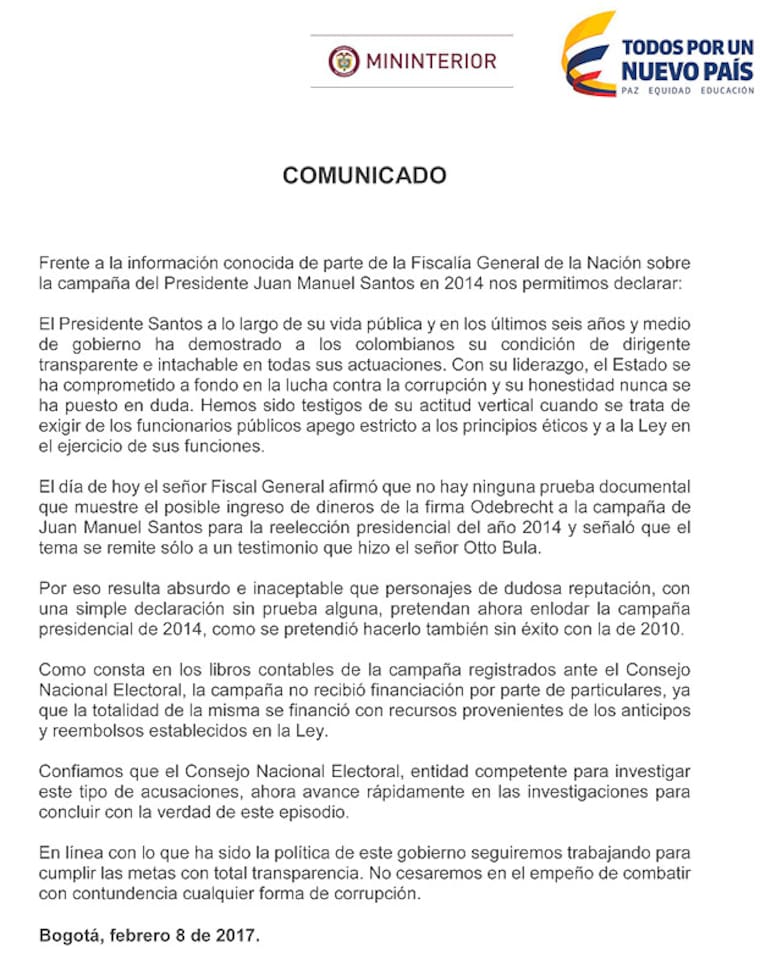 Esta declaración conjunta se conoce horas después de que el presidente Santos, vía red social Twitter, pidió al Consejo Nacional Electoral, CNE, una 'investigación a fondo' sobre el caso Odebrecht. Lea: Santos solicita a CNE una 'investigación a fondo y rápida' sobre caso Odebrecht