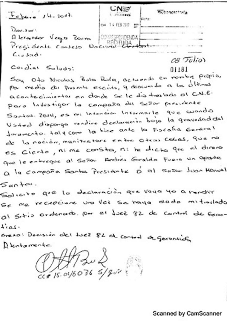 En rueda de prensa este martes, Alexánder Vega, presidente del Consejo Nacional Electoral, CNE, informó que, en el marco de la pesquisa que se sigue por la supuesta llegada de un millón de dólares de Odebrecht a la campaña de 2014 del presidente Juan Manuel Santos, 'hoy se recibió un manuscrito firmado por Otto Bula, en el que dice al CNE que (...) no le consta ni es cierto que ese presunto dinero haya entrado a la campaña del presidente'.