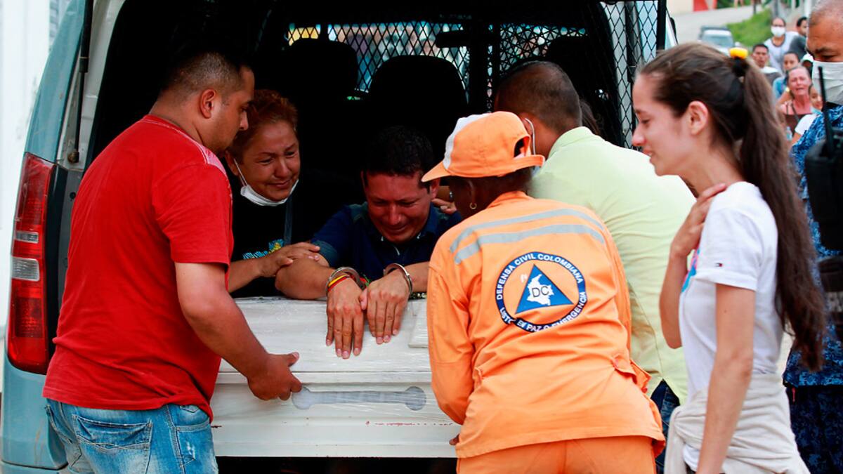 Allí, los guardias del Instituto Nacional Penitenciario y Carcelario (INPEC) permitieron al preso, pese a sus esposas, darle un último abrazo al ataúd en uno de los momentos más emotivos de la tragedia que comenzó en la noche del viernes cuando el río Mocoa y sus afluentes Sangoyaco y Mulatos se salieron de su cauce por las lluvias torrenciales.