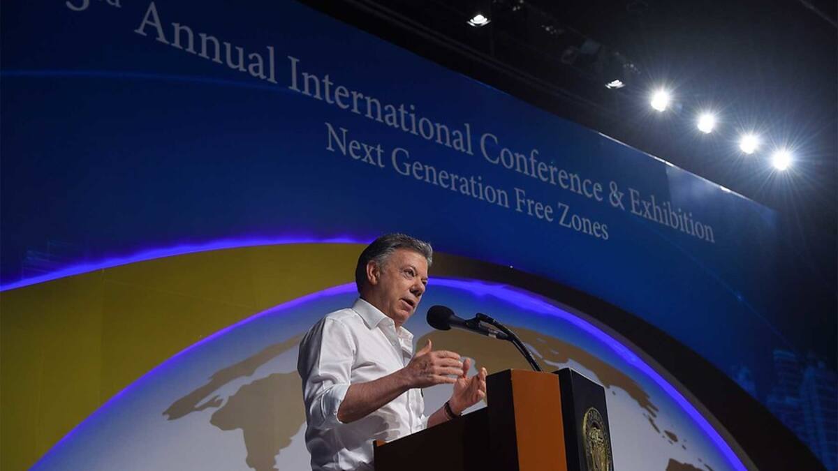 'Paz, economía y zonas francas están todas conectadas', dijo Santos, y habló del último hallazgo petrolero en el mar Caribe, del crecimiento de la economía, del aumento de zonas francas en su Administración, de las cifras del desempleo, de la inversión extranjera y de la reducción de la pobreza.