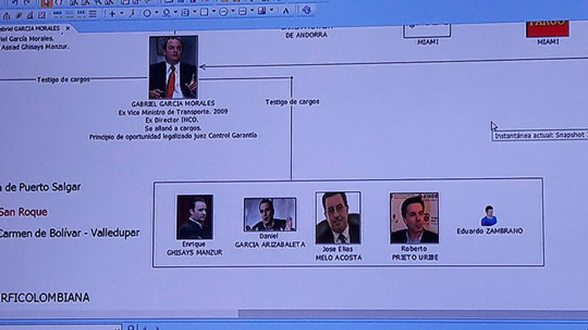 En una gráfica exhibida durante la diligencia, se pudo ver que García Morales, a partir de su negociación con la justicia, contará lo que sabe frente a Prieto; el empresario cartagenero Enrique Ghisays; el expresidente de Corficolombiana, José Melo; el contratista de la Agencia Nacional de Infraestructura, ANI, Eduardo Zambrano y el exdirector del Invías, Daniel García Arizabaleta.
