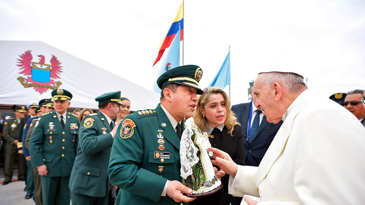 'Y eso que hizo Jesús: nos pacificó con el Padre, puso en juego su vida y la entregó', les recordó el Sumo Pontífice a los militares congregados en la Base Militar de Catam, poco antes de salir para Villavicencio en cumplimiento de la segunda jornada de su visita pastoral.