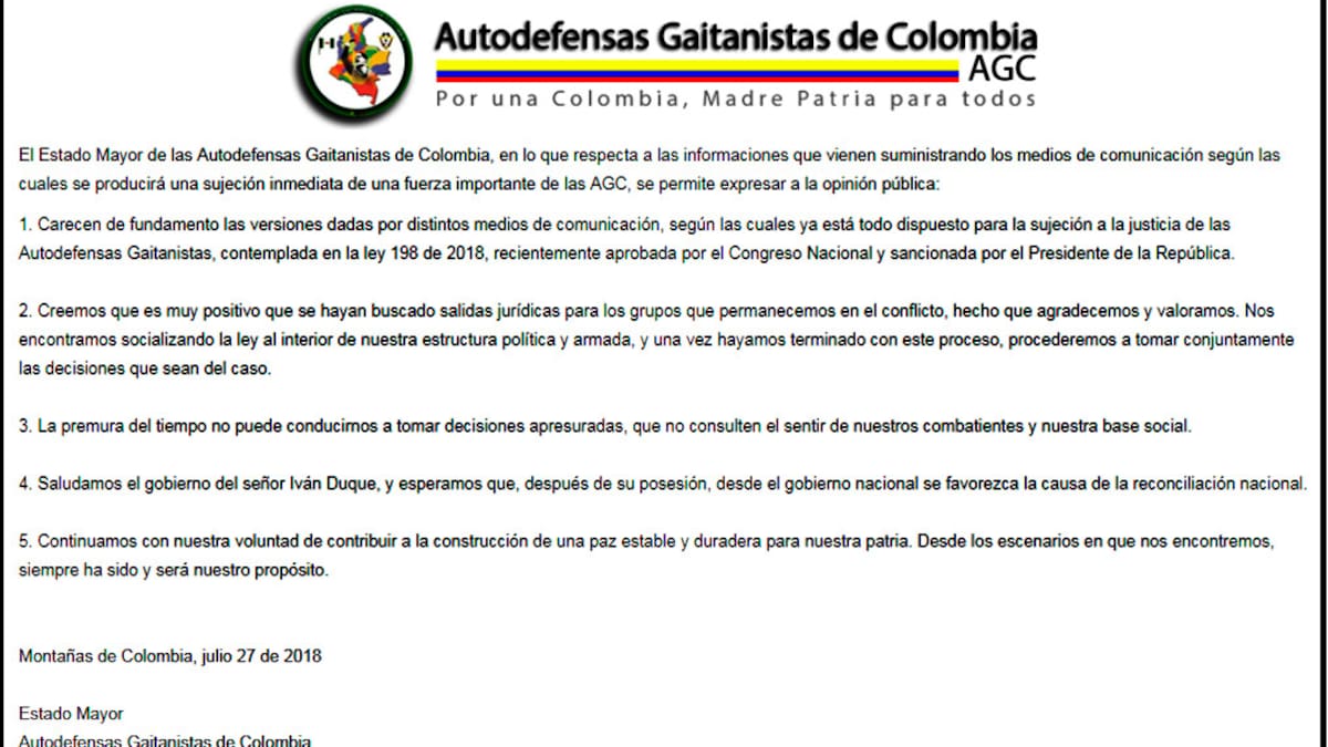 1. Carecen de fundamento las versiones dadas por distintos medios de comunicación, según las cuales ya está todo dispuesto para la sujeción a la justicia de las Autodefensas Gaitanistas, contemplada en la ley 198 de 2018, recientemente aprobada por el Congreso Nacional y sancionada por el Presidente de la República.