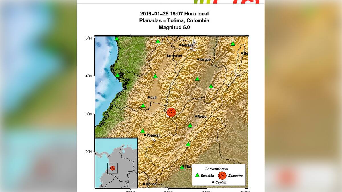 El evento tuvo como epicentro al municipio de Planadas, Tolima, con una profundidad superficial (menor a 30 kilómetros) y se sintió en Cali, Bogotá, Ibagué, Neiva, Mocoa, Armenia, Pereira y Manizales.