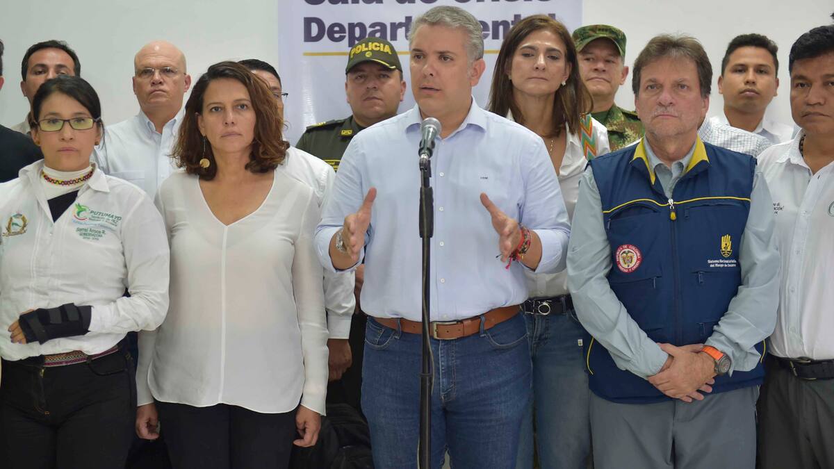 'Hemos hablado de distintas acciones de respuesta por parte del Gobierno Nacional que empiezan por levantar el inventario de damnificados con la Unidad de Gestión del Riesgo, abastecer a los municipios de los instrumentos de atención rápida humanitaria, de valorar las obras de mitigación y determinar la forma en que se van a implementar, así como de articular el transporte y la remoción de material que ha obstaculizado el tránsito por las principales arterias viales', declaró el presidente Duque, tras reunirse con la Gobernadora y alcaldes.