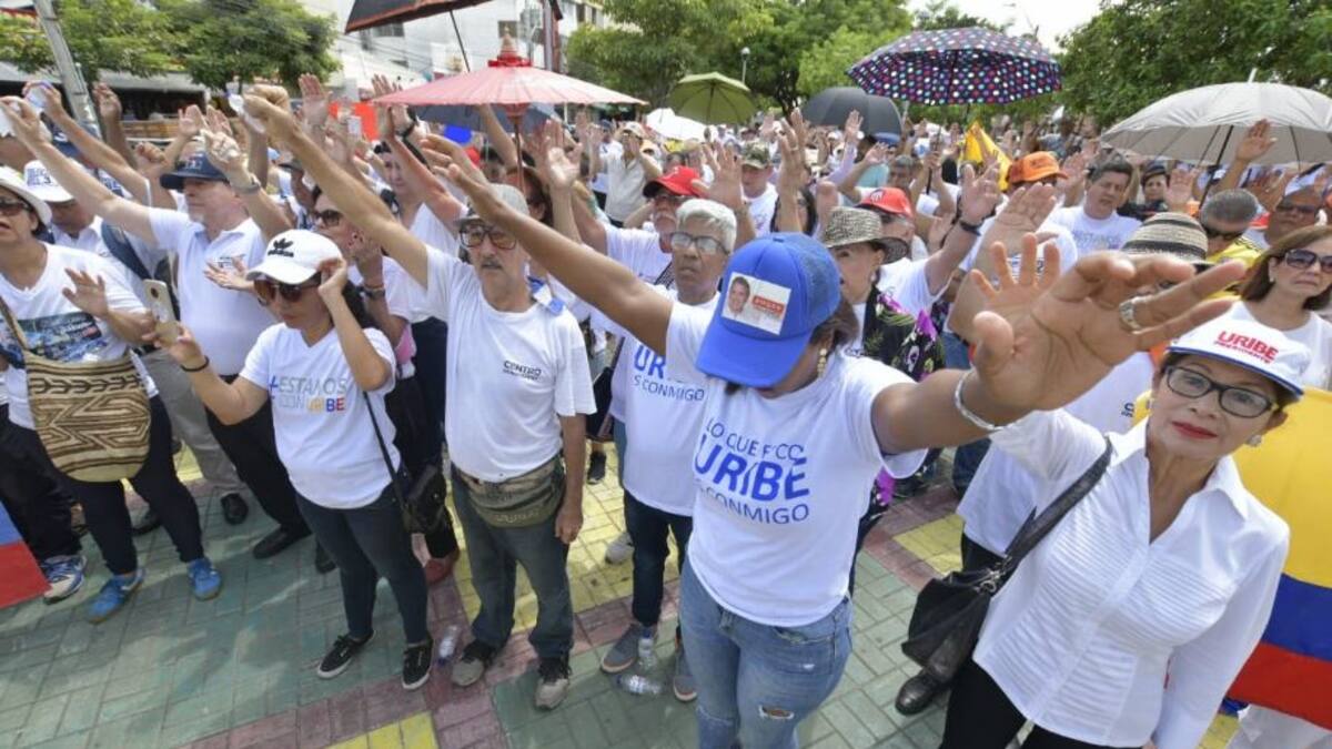 En la Plaza Bolívar, simpatizantes del uribismo al unísono coreaba: 'Estamos con Uribe'; mientras que desde la tarima jóvenes cartageneros improvisaban un rap en el que resaltaban su apoyo al máximo líder del Centro Democrático.
