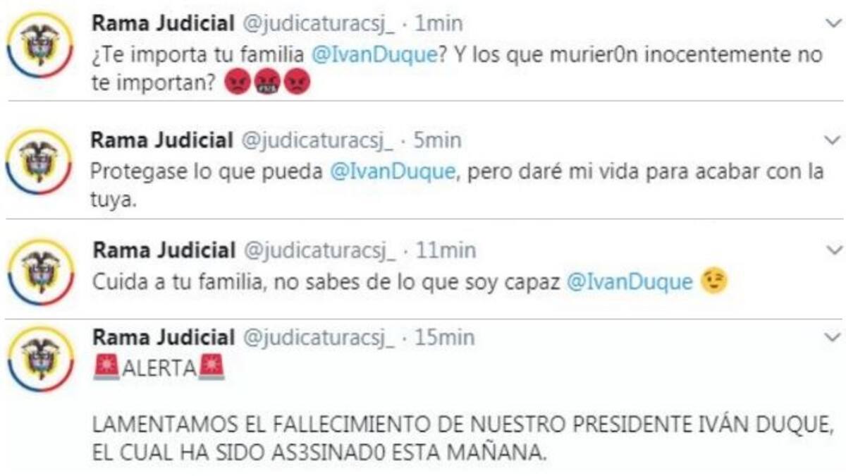 Al parecer, la cuenta de Twitter del Consejo Superior de la Judicatura (@judicaturacsj_) habría sido hackeada por personas que, entre otros improperios, llegaron hasta a anunciar la muerte del jefe de Estado.