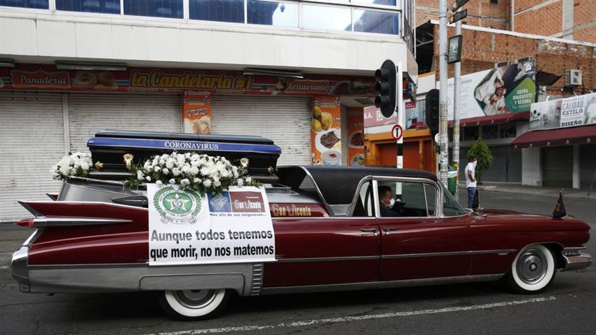 La iniciativa, liderada por la Policía Metropolitana de Medellín, donde hay 43 casos confirmados, hace parte de la campaña 'Aunque todos tenemos que morir, no nos matemos', mensaje que porta el carro que ha sido decorado con flores blancas y que transporta un cofre con una cinta con el nombre 'coronavirus'.