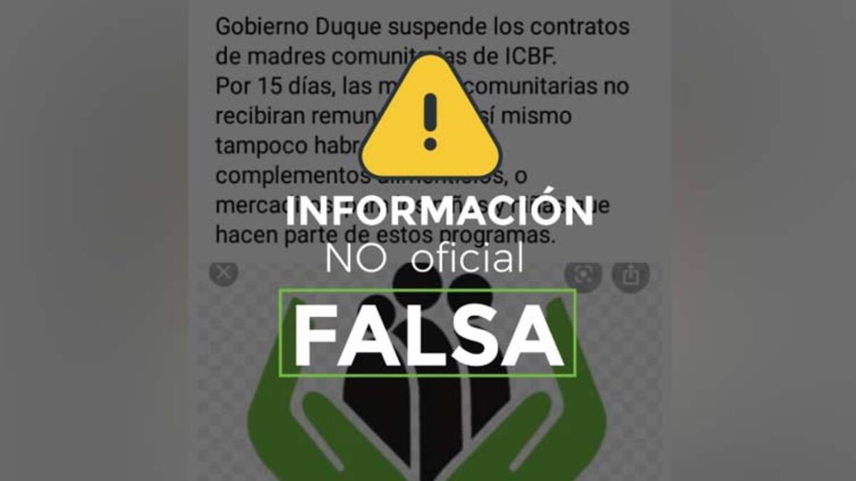 El Instituto Colombiano de Bienestar Familiar, Icbf, por medio de sus redes sociales alertó a la comunidad para que no se dejen engañar por las noticias falsas, refiriendose a la información que circula en redes sociales y cadenas de chat, que indica que el Gobierno de Iván Duque suspenderá contratos a madres comunitarias.
