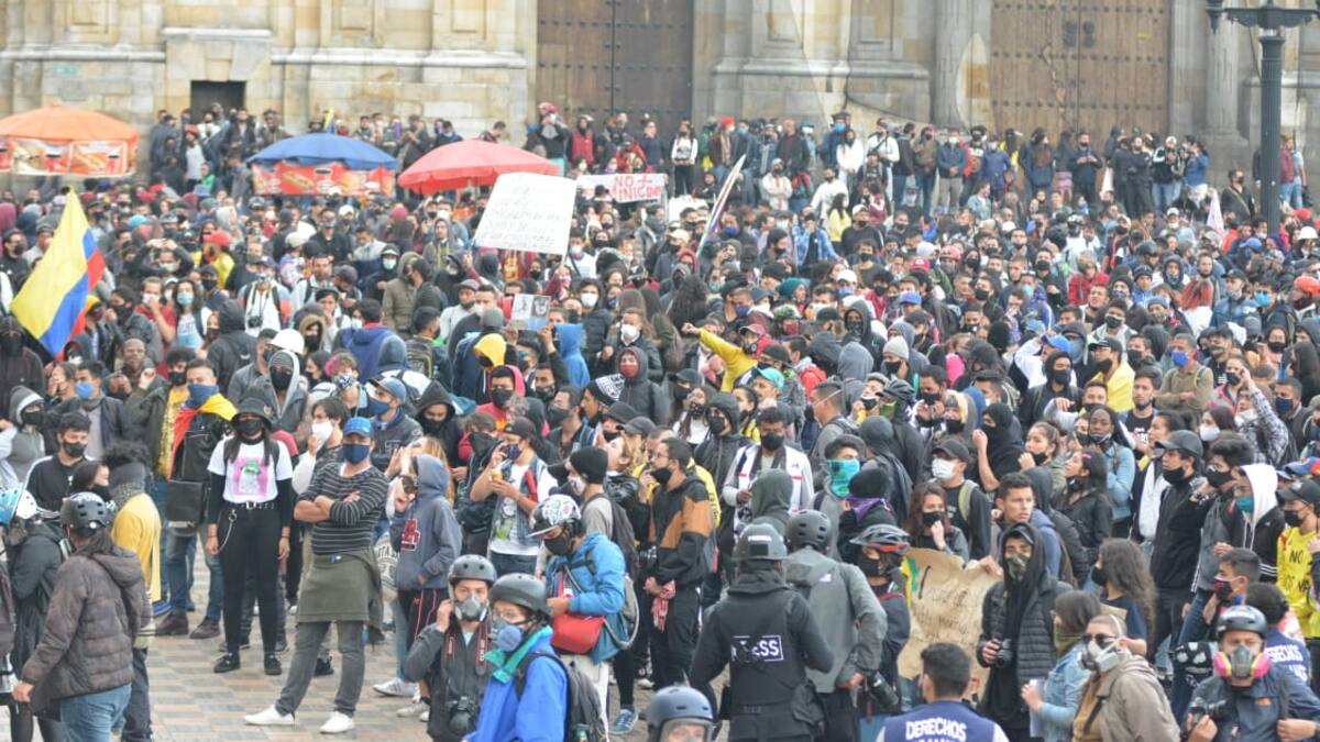 Centrales obreras, Fecode, grupos estudiantiles y organizaciones sociales manifiestan en Bogotá por el derecho a la vida, contra el abuso policial.