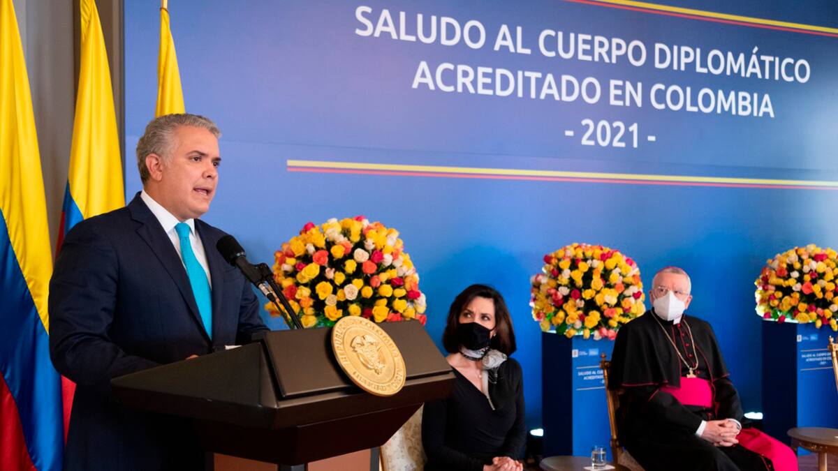 En el marco del saludo este martes al cuerpo diplomático en Colombia, el presidente Iván Duque hizo un llamado 'a toda la colaboración internacional para que garanticemos que este proceso de adquisición, suministro, entrega y universalización de las vacunas proceda sin ningún tipo de obstáculos'.