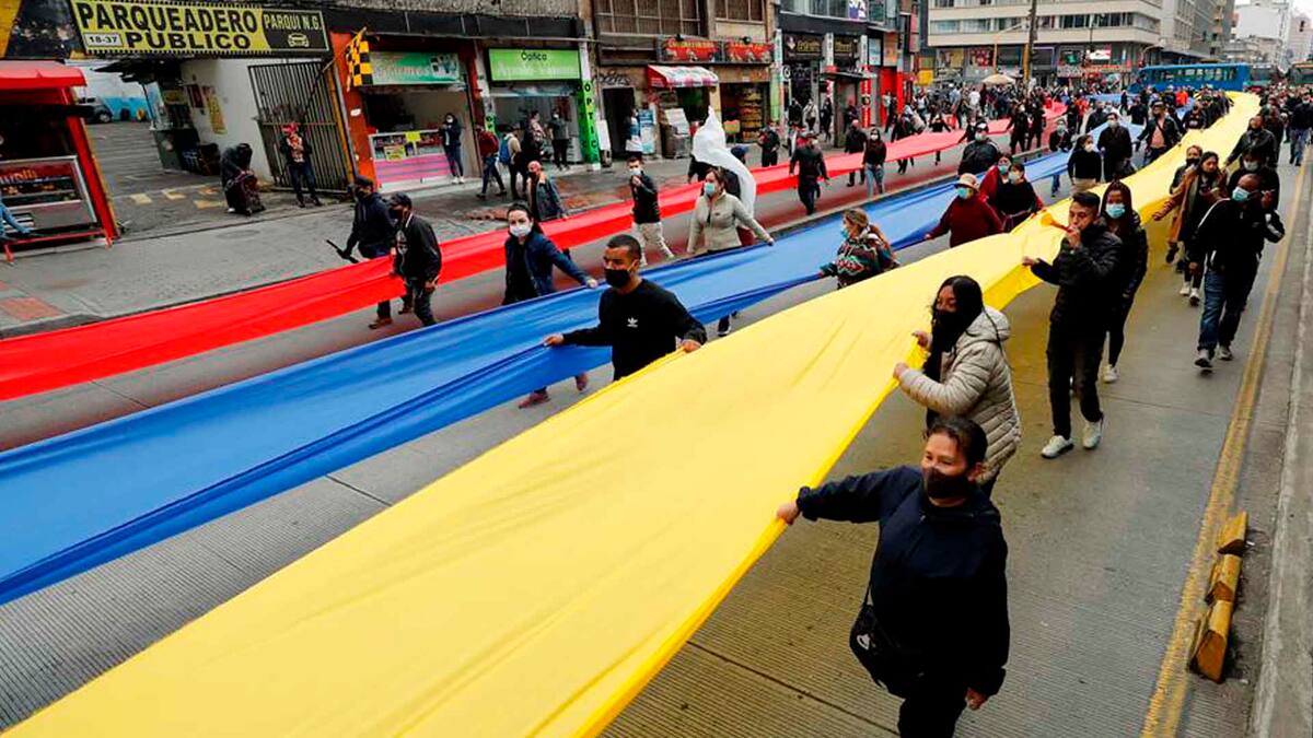 En la carrera Décima, donde está ubicada la zona de San Victorino y en la que trabajan los vendedores de los 'madrugones', los manifestantes cargaron tres telas gigantes: una amarilla, otra azul y la última roja y formaron una bandera de Colombia de más de 100 metros de largo.