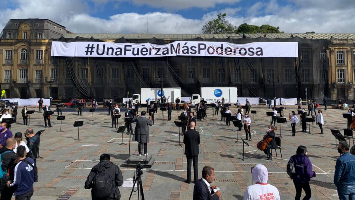 La Orquesta Filarmónica de Bogotá se presentó en la Plaza de Bolívar en un acto simbólico y como apoyo a la NO violencia. Fotos EFE y Kike Barona