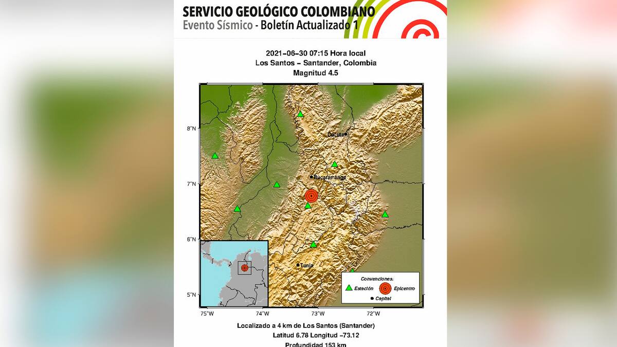 En la mañana de este miércoles el Servicio Geológico Colombiano, SGC, dio a conocer que se presentó un sismo de magnitud 4.5 en el departamento de Santander.
