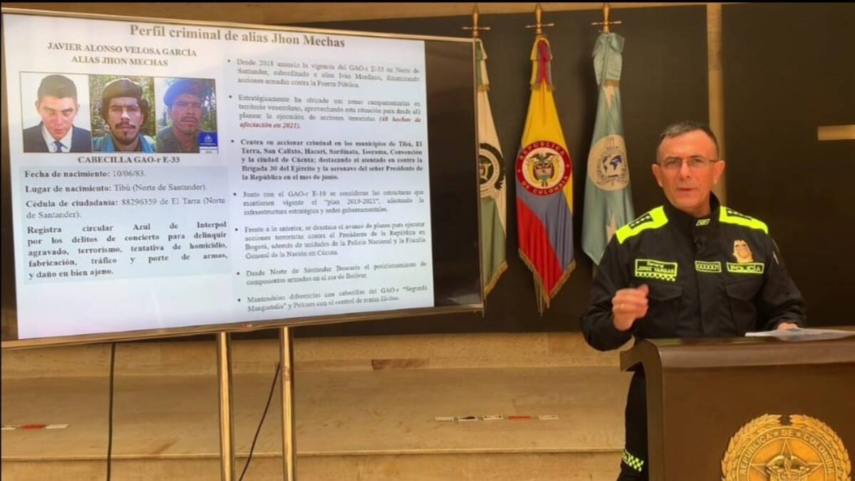 Sobre Jhon Mechas, el máximo directivo de la Policía, informó que ingresó a las Farc en 1996, posteriormente pasó a las milicias bolivarianas, luego se incopora como guerrillero en el frente 33 de las Farc. En 2016 empieza a organizar bajo el mando de Iván Mordisco y Gentil Duarte el frente 33 de las disidencias de las Farc. Tenemos información en este momento de que él con su grupo principal, podría encontrarse en el estado Zulia en Venezuela', sostuvo.