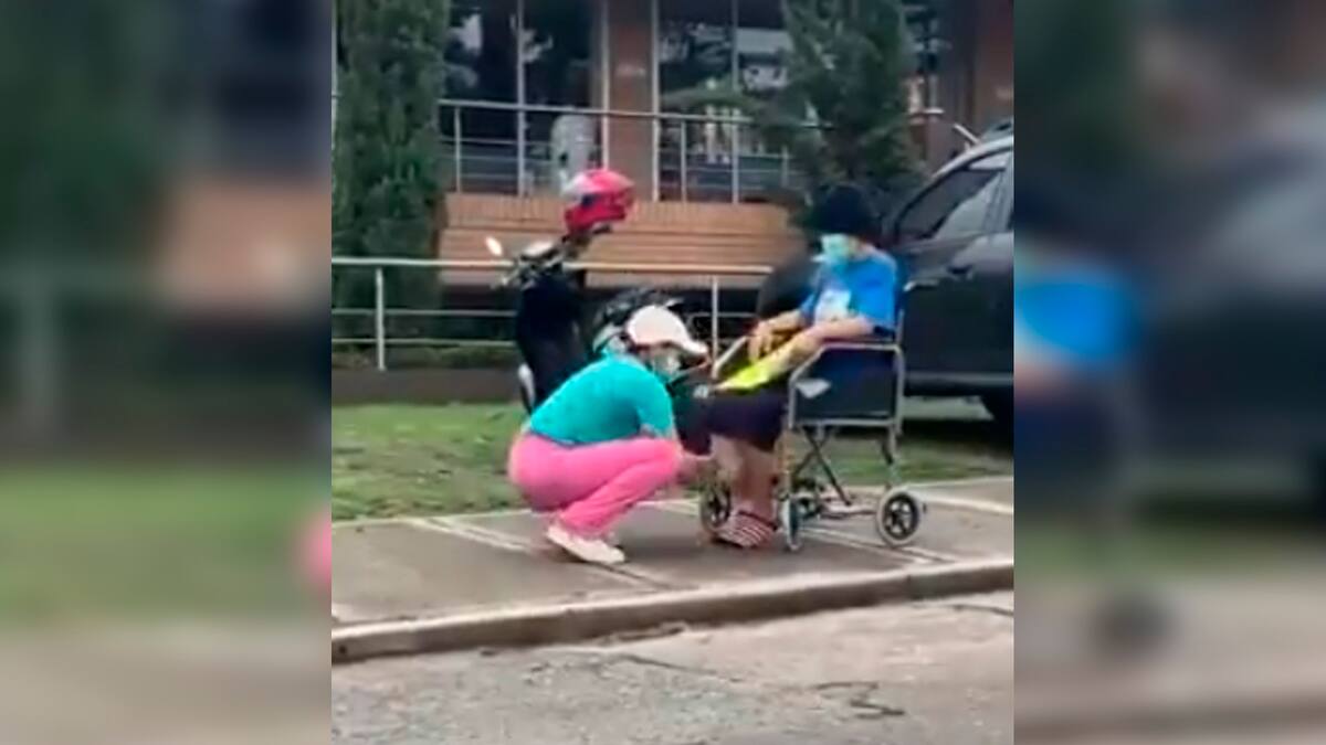 Tal y como lo mencionó, la mujer parqueó su moto en el lugar y bajó una silla de ruedas. Luego de esto, le pone a la menor una venda elástica en su pierna.