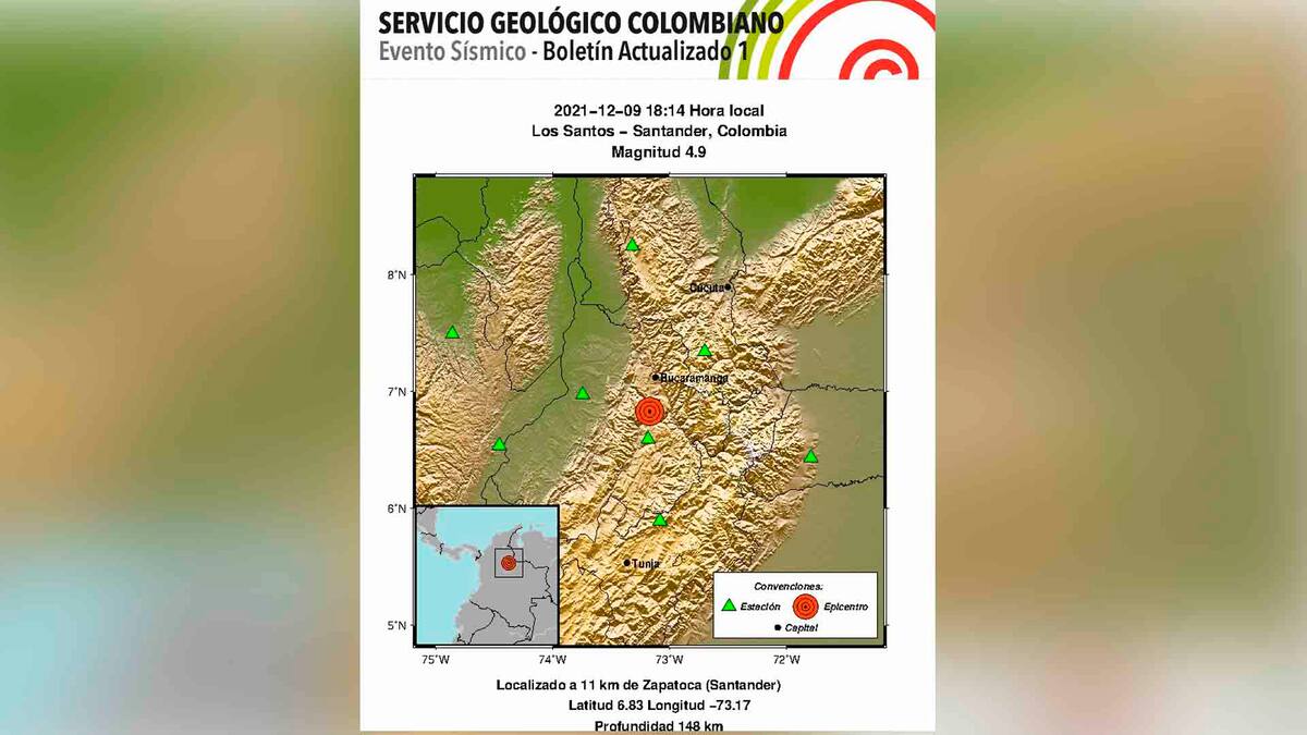 Un temblor de 4,9 grados de magnitud con epicentro en Los Santos, Santander, se sintió a las 6:14 de la tarde de este jueves