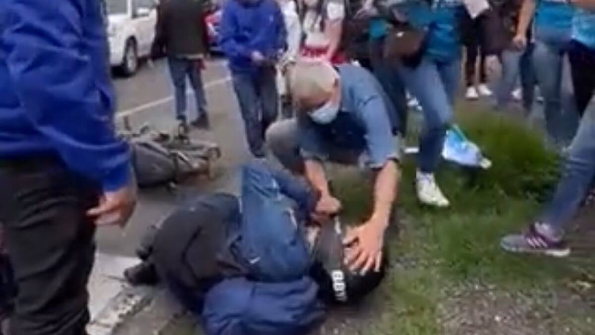 Segundos después, tras haber acelerado, el motociclista se estrelló con otra moto y cayó al suelo.