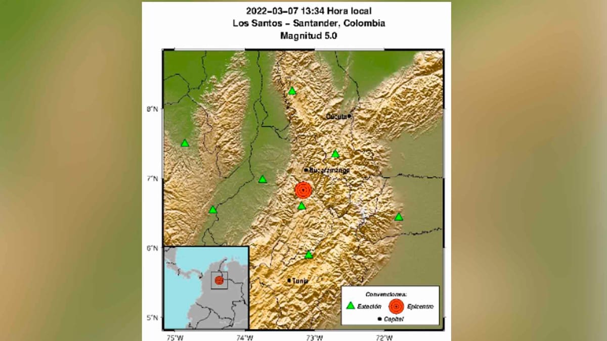 Este lunes un fuerte sismo se registró en el departamento de Santander. De acuerdo con el Servicio Geológico Colombiano el movimiento telúrico fue de 5.0 grados en la escala de richter y tuvo su epicentro en el municipio Los Santos.