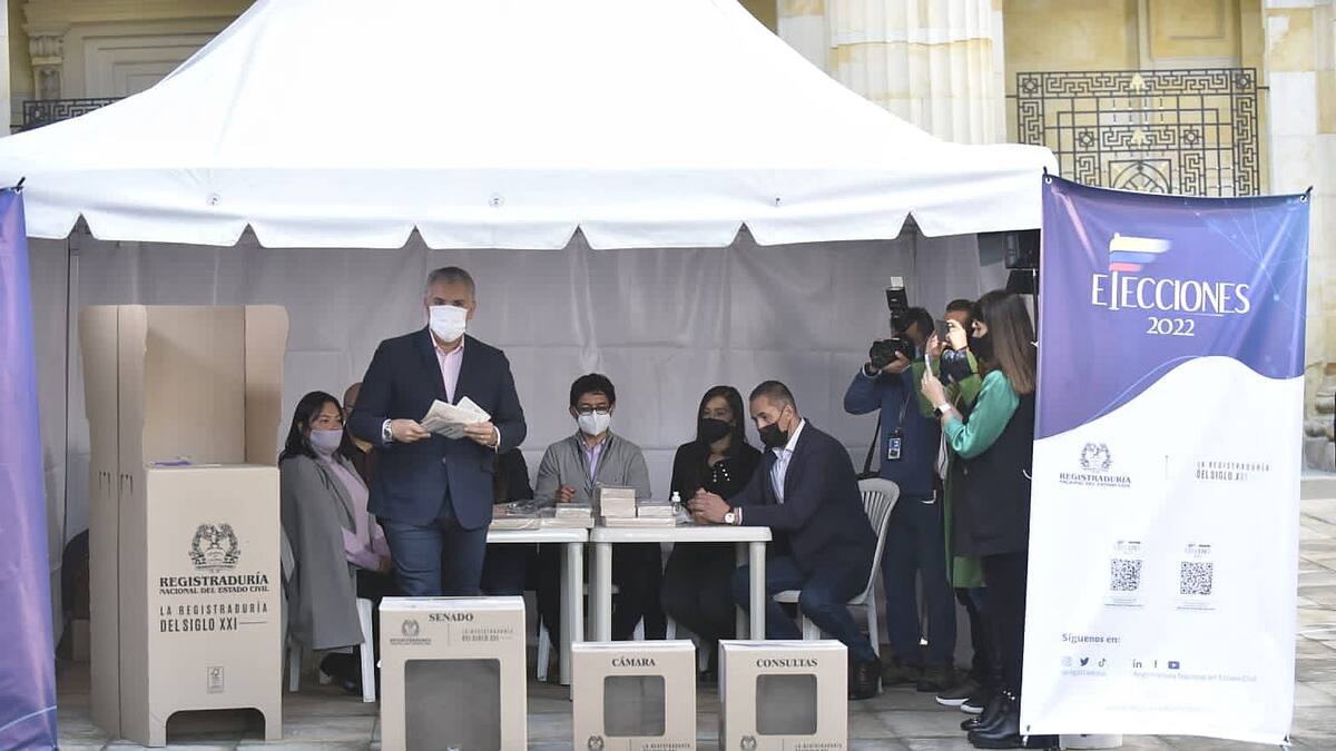 Duque fue el primer ciudadano en ejercer su derecho al voto, a las 8:00 en punto en la mesa electoral número 1, instalada en el Capitolio Nacional, situado en el costado sur de la Plaza de Bolívar de Bogotá, y llegó acompañado de la primera dama, María Juliana Ruiz, junto a miembros de su equipo de Gobierno.