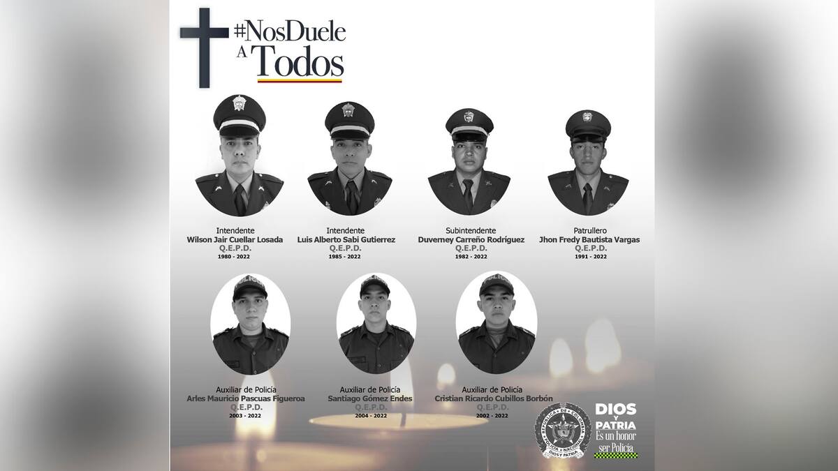 La Policía informó este sábado en un comunicado que rinde homenaje a los siete policías asesinados en una emboscada el pasado viernes en el corregimiento de San Luis, en Huila.