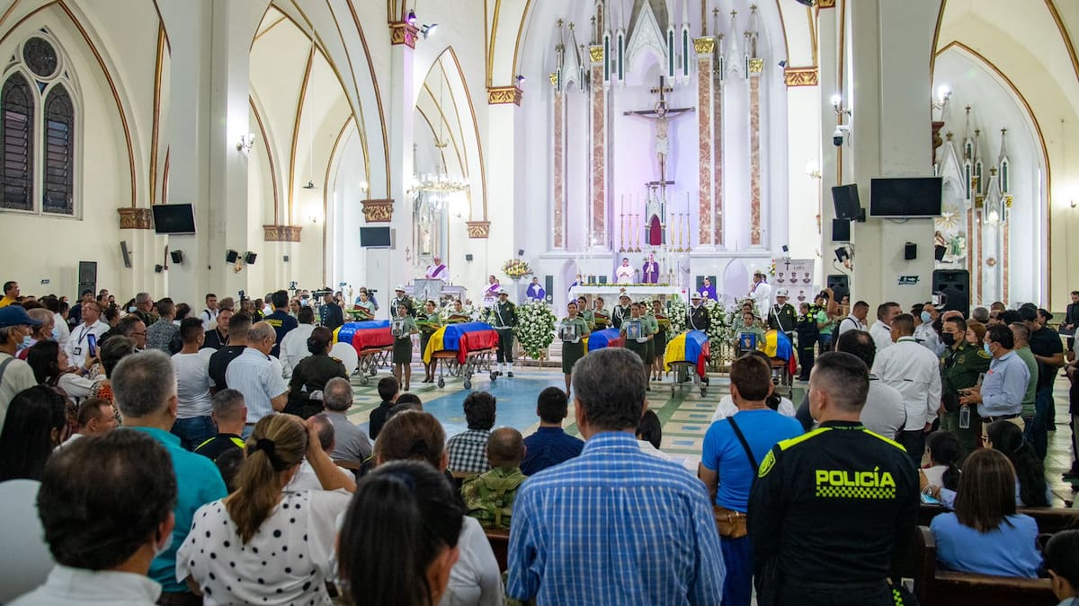 El presidente Gustavo Petro asistió este martes a la Catedral de la Inmaculada Concepción, en Neiva, para las honras fúnebres de cinco de los siete policías que murieron en el ataque perpetrado en el corregimiento de San Luis el pasado viernes.