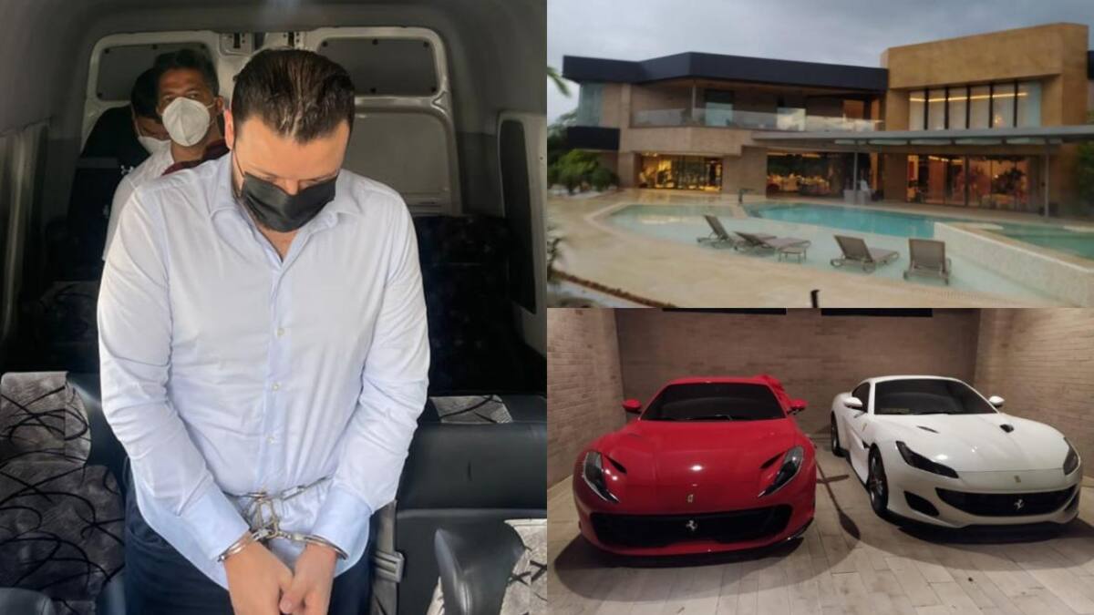 Las autoridades hallaron en el interior de la vivienda un gigantesco garaje que contenía carros importados de Francia, Italia y Alemania. La vivienda tiene sede deportiva, gimnasios, teatros, parques y piscinas, entre otros espacios y objetos de lujo.