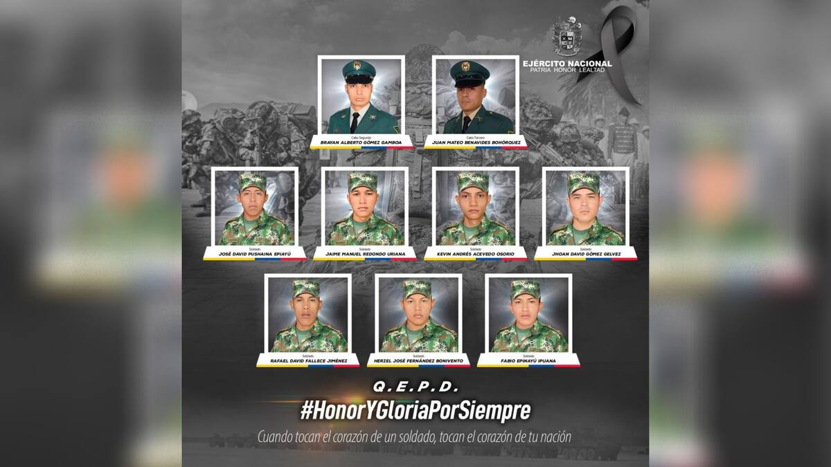 'Condolencias a las familias de los oficiales fallecidos Brayan Gómez Gamboa y Juan Benavides Boorquez; a los soldados Kevin Acevedo Osorio, Hercel Fernández Bonivento, Johan Gómez Gelves, José David Pushaina Epiayu, Fabio Epiayu Ipuana, Rafael Fallace Jiménez y Jaime Manuel Redondo Uriana', señaló Velásquez.