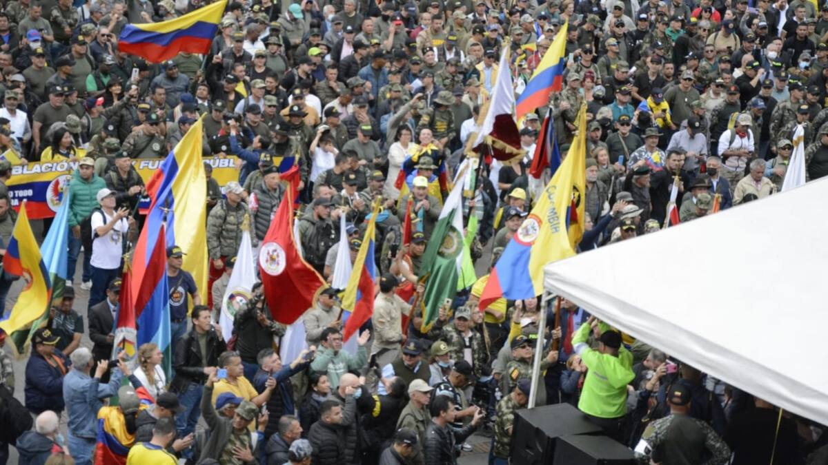 Veteranos y reservistas de la fuerza pública llenaron este miércoles la Plaza de Bolívar en protesta contra el gobierno de Gustavo Petro.