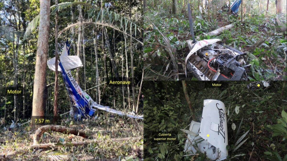 En los restos hallados el pasado 16 de mayo los investigadores detallaron que 'la sección de cabina principal no presentó reducción significativa de espacio ocupacional; sin embargo, la sección frontal sufrió la principal afectación y gran daño estructural, pues en ella ocurrió una alta disipación de energía cuando la aeronave golpeó, inicialmente contra los árboles, y luego en su impacto contra el terreno, sin el motor'.