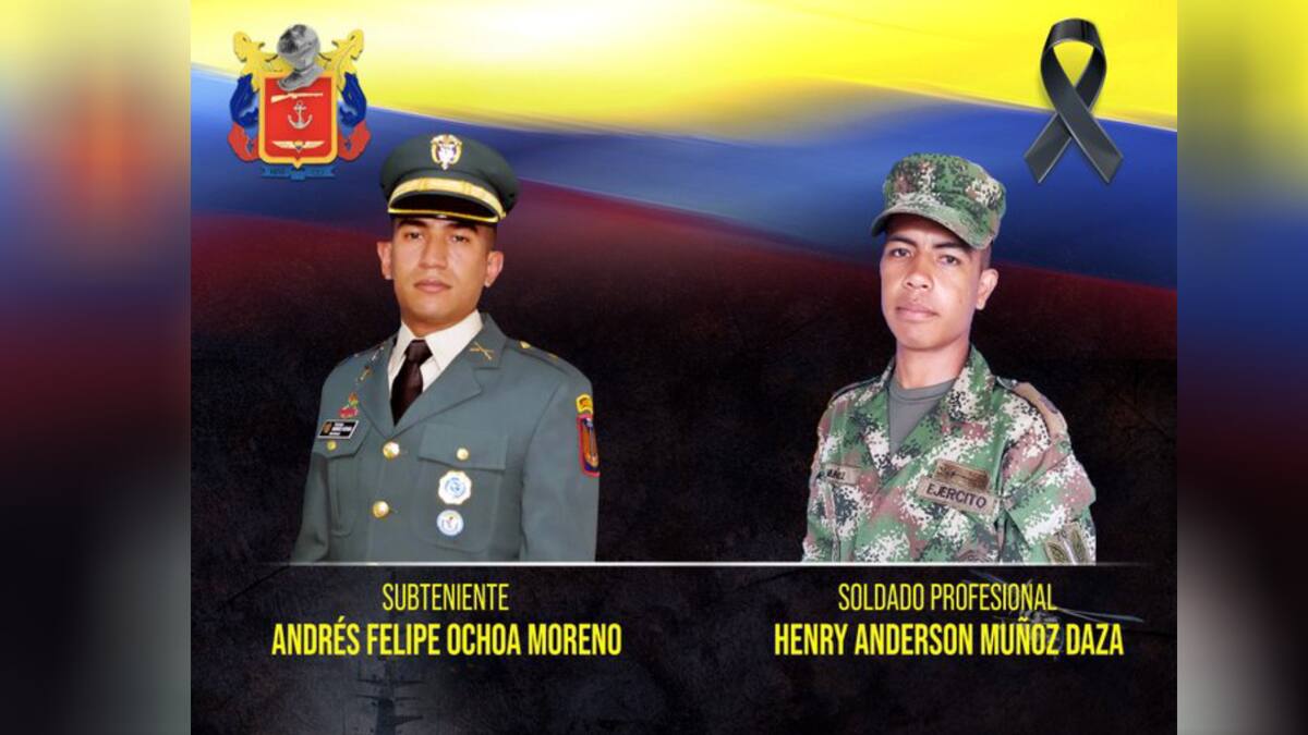 Se trata del subteniente Andrés Felipe Moreno y el soldado profesional Anderson Muñoz, quienes se enfrentaban contra la estructura Rodrigo Cadete de las disidencias en zona rural del municipio El Doncello.