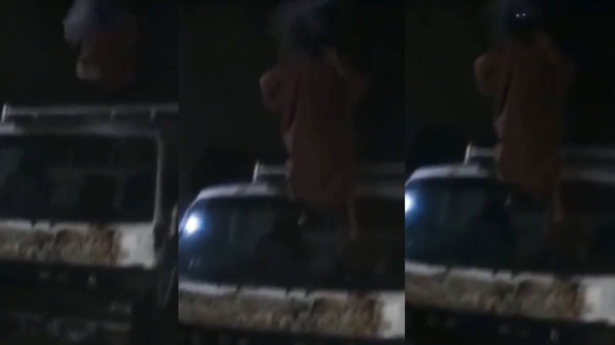 En ese sentido, la supuesta bruja se encuentra sobre la plataforma de carga del vehículo, de pie y moviéndose de manera espasmódica.