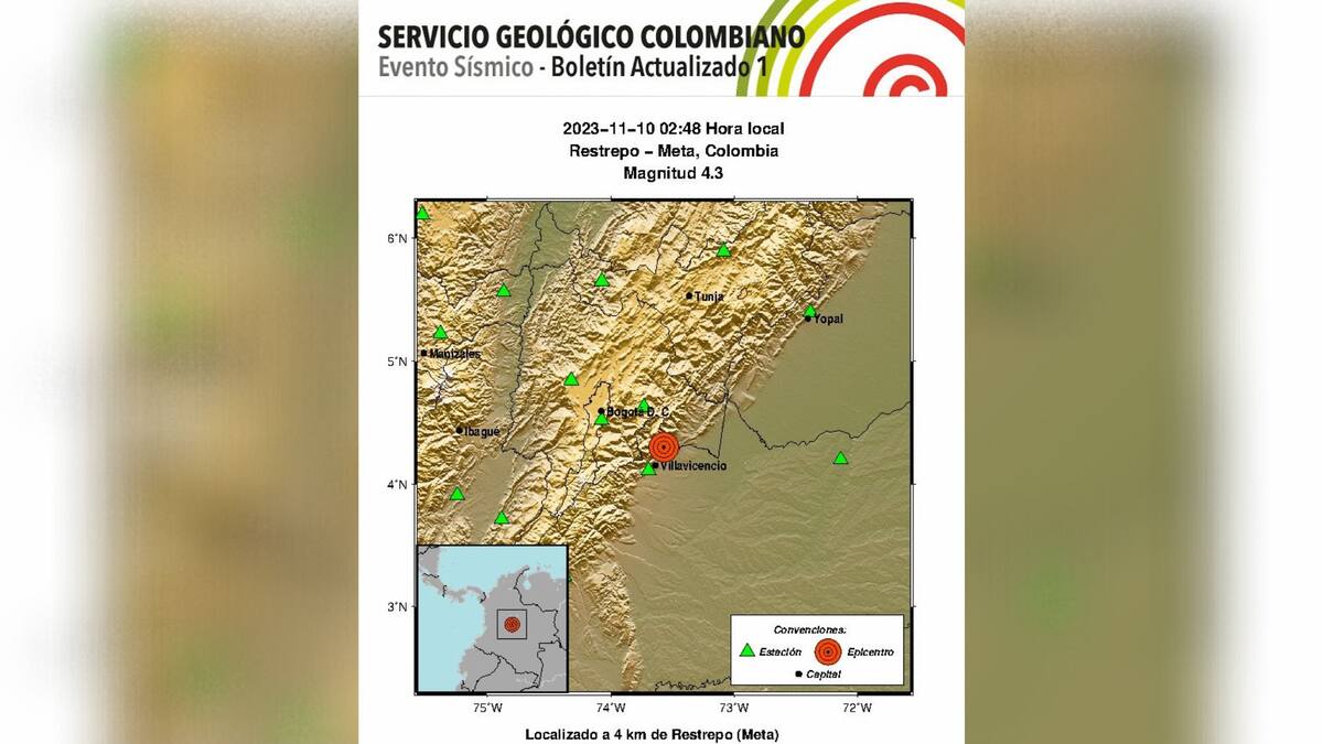 Según el Servicio Geológico Colombiano, se suscitó a las 2:48 de la madrugada, con epicentro en el municipio de Restrepo, en el departamento del Meta, con magnitud de 4.3 y profundidad superficial menor a 30 km.