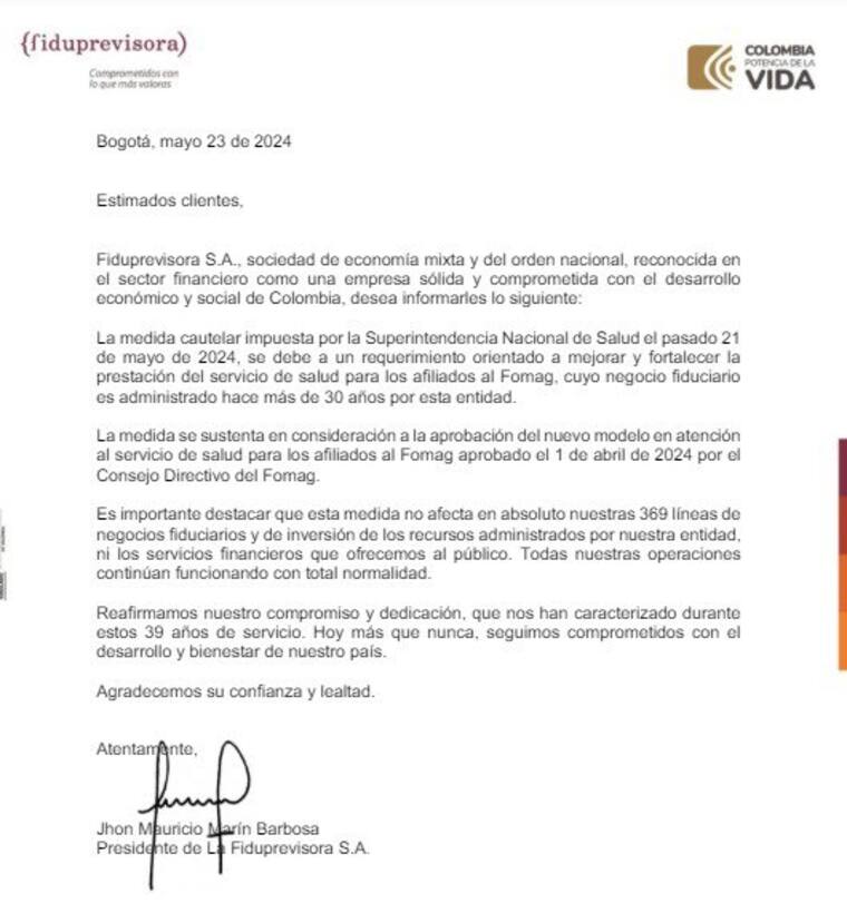 La carta también reafirma el compromiso de Fiduprevisora con el desarrollo y bienestar del país, destacando sus 39 años de servicio continuo. La empresa enfatiza su dedicación a sus clientes y su rol en el sector financiero, subrayando que, a pesar de la medida cautelar, sus operaciones y la gestión de las inversiones permanecen estables y seguras.
