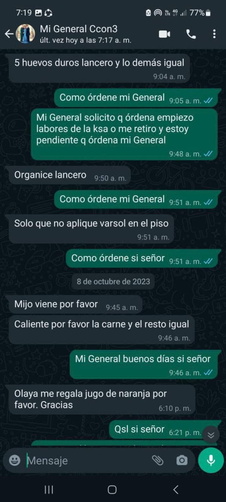 Inclusive, en varios chats se lee que la esposa del general también le daba órdenes a los militares de cómo lavar la ropa o preparar la comida.