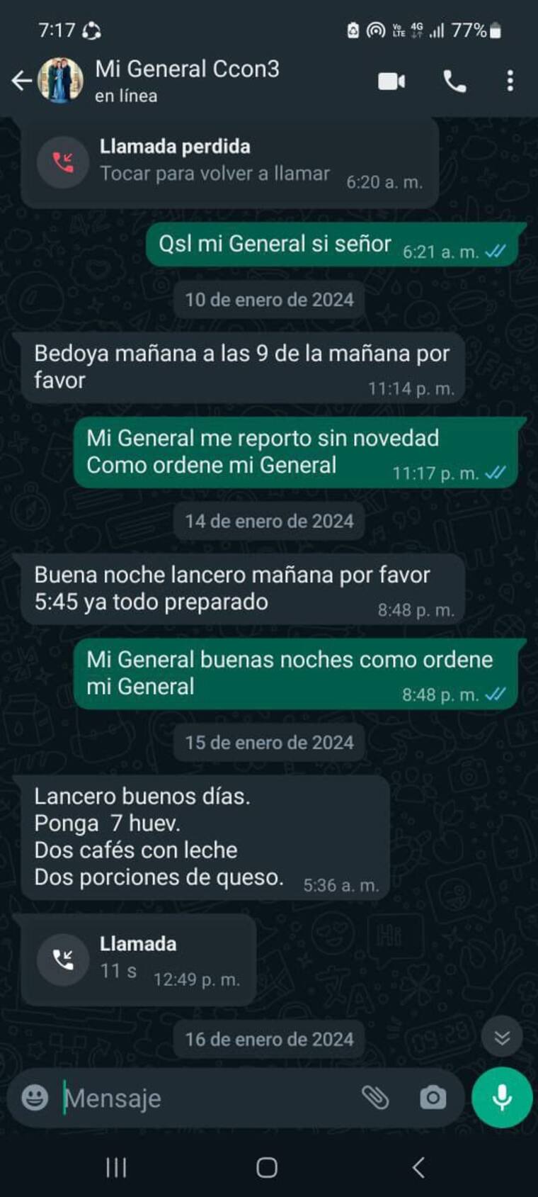 De acuerdo con la denuncia que se viralizó en redes sociales, el alto uniformado hizo uso inadecuado del personal militar que le fue asignado. En chats publicados en X se leen las polémicas órdenes que daba el general Pérez a sus subalternos.