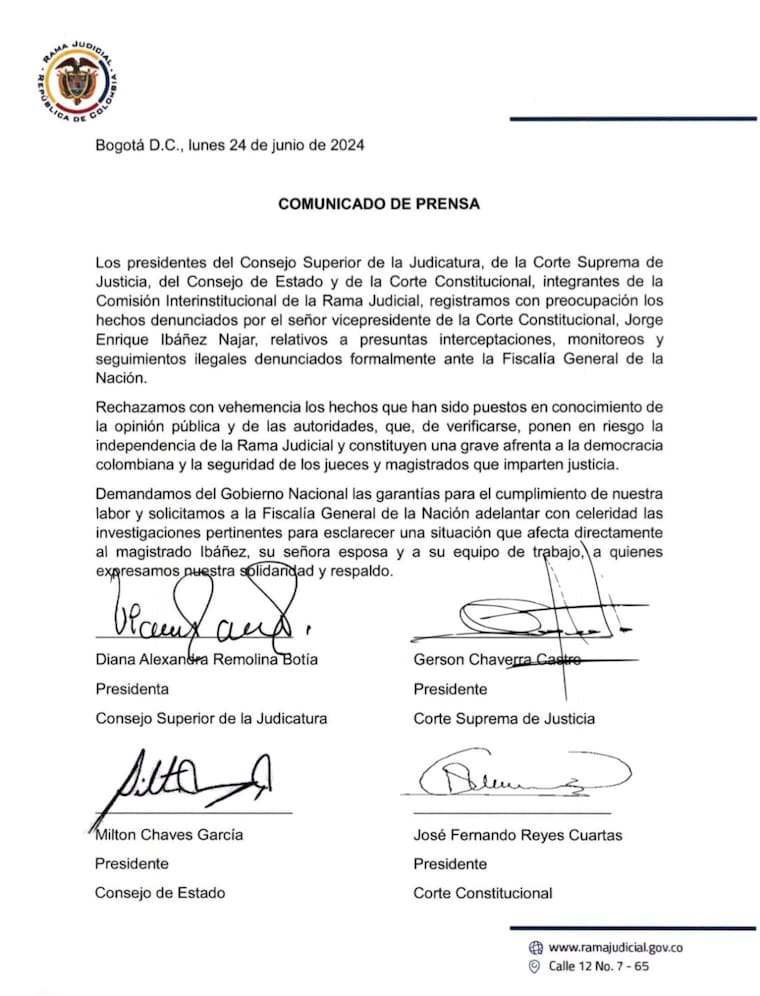 “Rechazamos con vehemencia los hechos que han sido puestos en conocimiento de la opinión pública y de las autoridades, que, de verificarse, ponen en riesgo la independencia de la Rama Judicial y constituyen una grave afrenta a la democracia colombiana y la seguridad de los jueces y magistrados que imparten justicia”, se lee en el comunicado de la Rama Judicial en pleno.