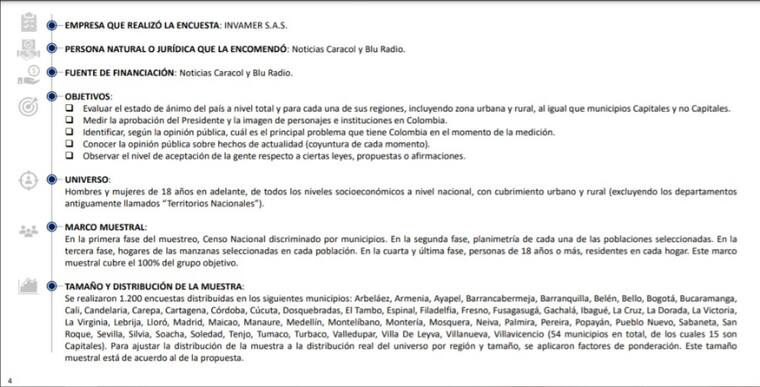 La encuesta fue realizada por la firma Invamer en 54 municipios, 15 de los cuales son capitales. Se llevaron a cabo 1.200 encuestas entre el 26 y el 29 de julio de 2024, y el margen de error es de 2,8%.
