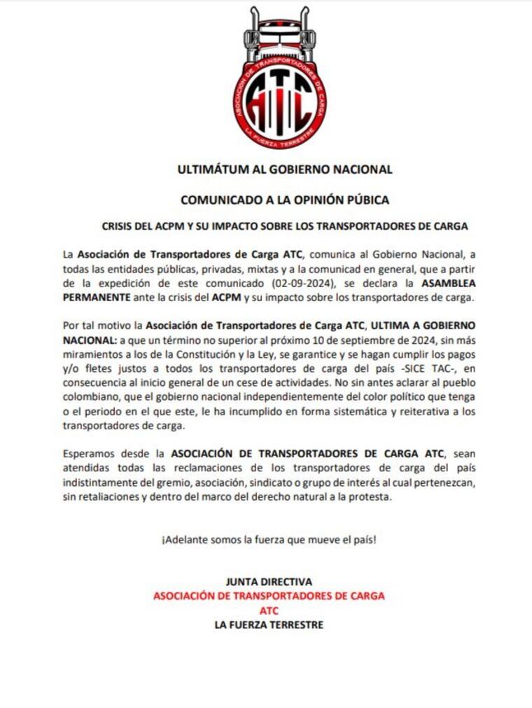 “la Asociación de Transportadores de Carga ATC, ultima al Gobierno Nacional: a que un término no superior al próximo 10 de septiembre de 2024, sin más miramientos a los de la Constitución y la Ley, se garantice y se hagan cumplir los pagos y/o fletes justos a todos los transportadores de carga del país -SICE TAC-, en consecuencia al inicio general de un cese de actividades”, exige el gremio en su comunicado.