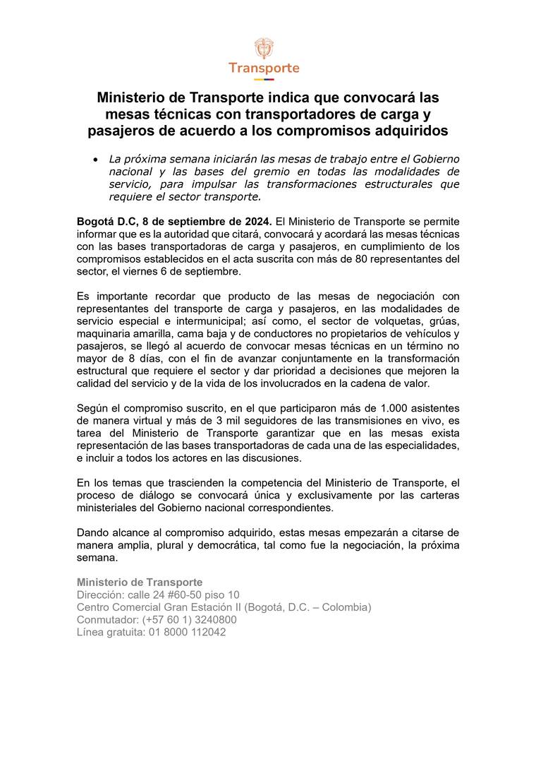 Para abordar los temas que exceden la competencia del Ministerio de Transporte, el diálogo será convocado exclusivamente por las carteras ministeriales correspondientes del Gobierno nacional.