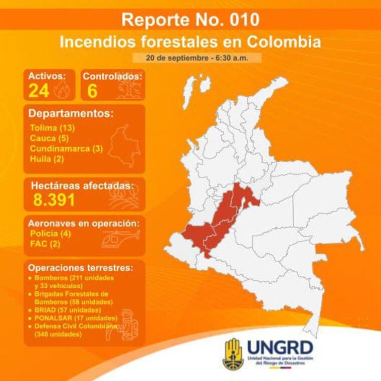 Estos 24 incendios forestales reportados este viernes por la Unidad Nacional para la Gestión del Riesgo de Desastres evidencia el rápido incremento en la cifra de conflagraciones de este tipo en el país, pues el pasado martes 17 de septiembre había 21, es decir, tres menos.
