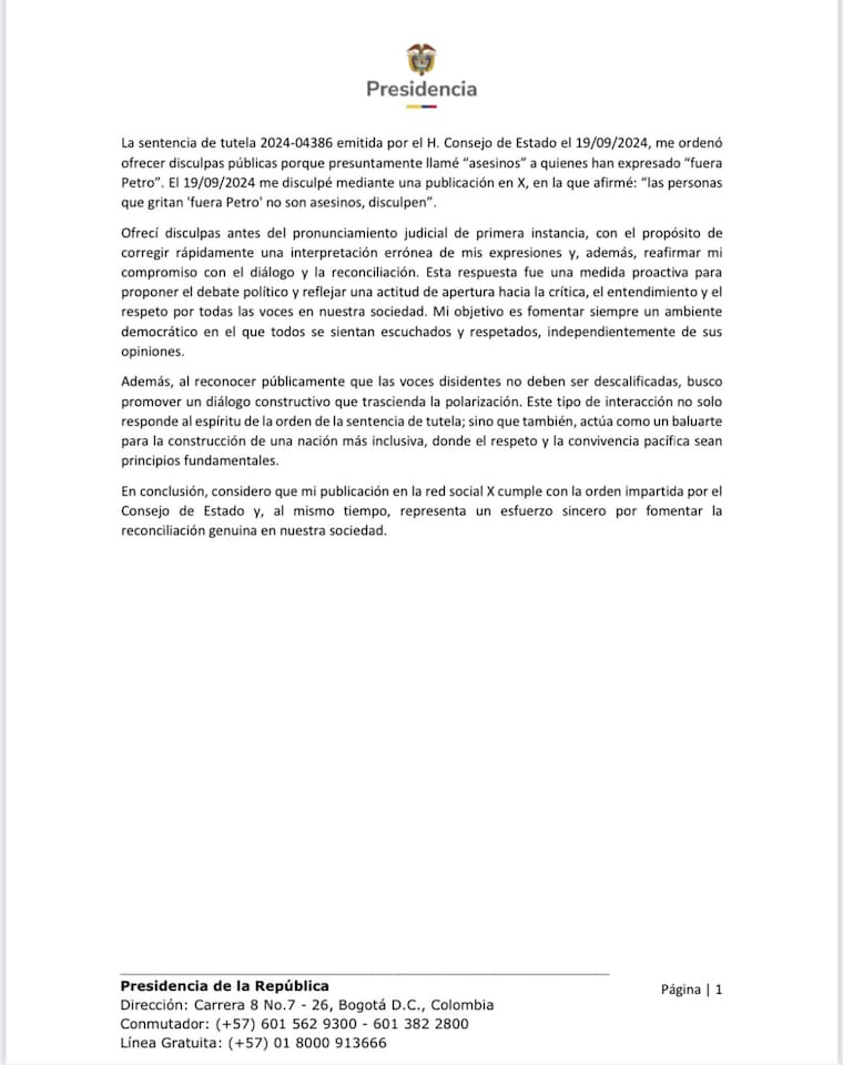 En el mismo escrito se añade que con las disculpas el presidente buscó promover un “diálogo constructivo que trascienda la polarización”, asegurando que en su publicación no solo se respondió a la tutela, sino que se quiere actuar como baluarte para la construcción de una nación más inclusiva.