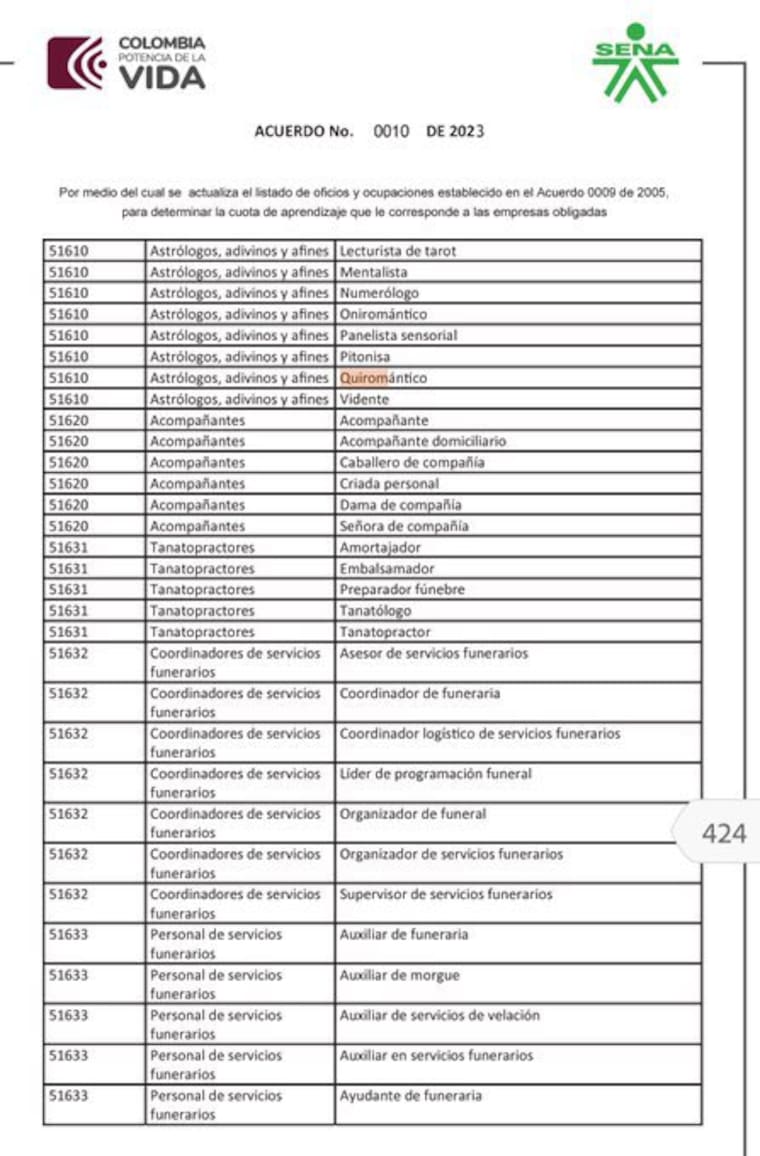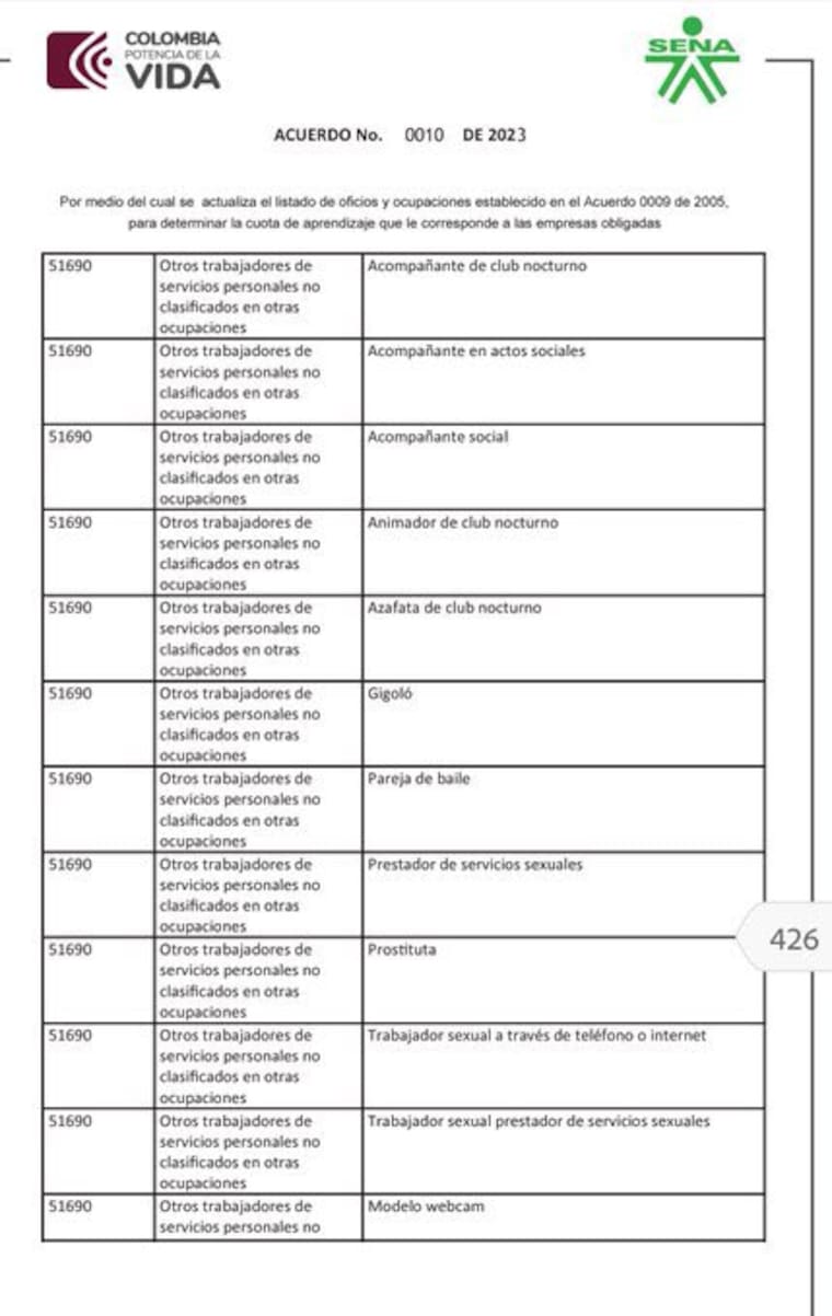 Entre los oficios que ahora forman parte del Acuerdo No. 0010 de 2023 se encuentran gigoló, dama de compañía, modelo webcam, tarotista y otros, lo que responde a una actualización en la clasificación de empleos basada en estándares internacionales.