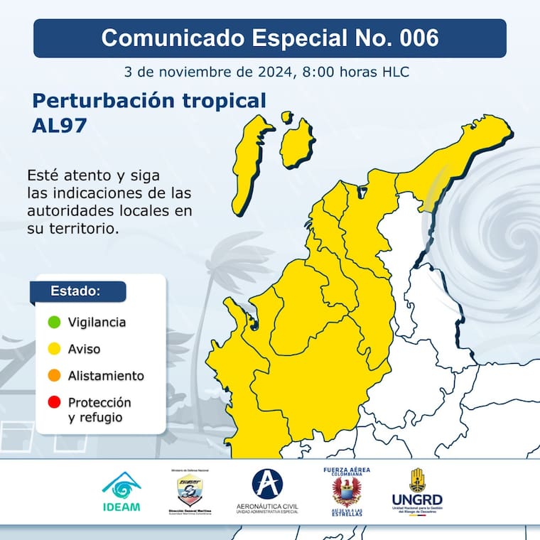 “La Mesa Técnica, conformada por el IDEAM, DIMAR, Aerocivil, la Fuerza Aérea Colombiana (FAC) y la Unidad Nacional para la Gestión del Riesgo de Desastres (UNGRD), continuará vigilando la evolución de la perturbación AL97″, enfatiza el comunicado.
