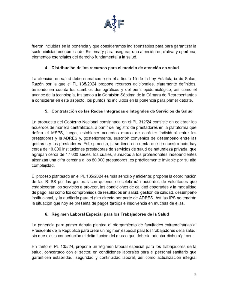 “Mientras el PL 135/24 de autoría de las instituciones médicas y de los profesionales de la salud, resalta la importancia de la existencia de un modelo de afiliación individual que garantice la representación integral del paciente a lo largo de toda la vida y de la ruta de atención. Esto incluye la atención desde el primer nivel hasta la de mediana y alta complejidad, para garantizar la continuidad del servicio. Las gestoras deben asumir la representación del usuario, el riesgo en salud y el riesgo operativo; el riesgo financiero es asignado a la ADRES en reconocimiento de lo dispuesto en el parágrafo del artículo 334 constitucional; aspectos que no están claros en la ponencia para primer debate”, se lee en el escrito.