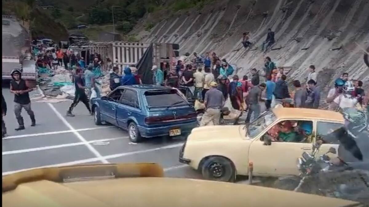 “Un tractocamión, que viene con una carga de bebidas gaseosas, se queda sin frenos y hace un volcamiento lateral izquierdo. Posteriormente, la ciudadanía llega al lugar y hurta esta mercancía”, dijo el teniente Cristian Valencia, jefe encargado de la Policía de Carreteras en el Quindío en diálogo con ‘Blu radio’.