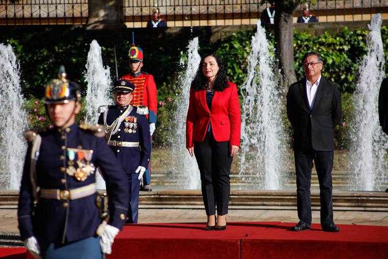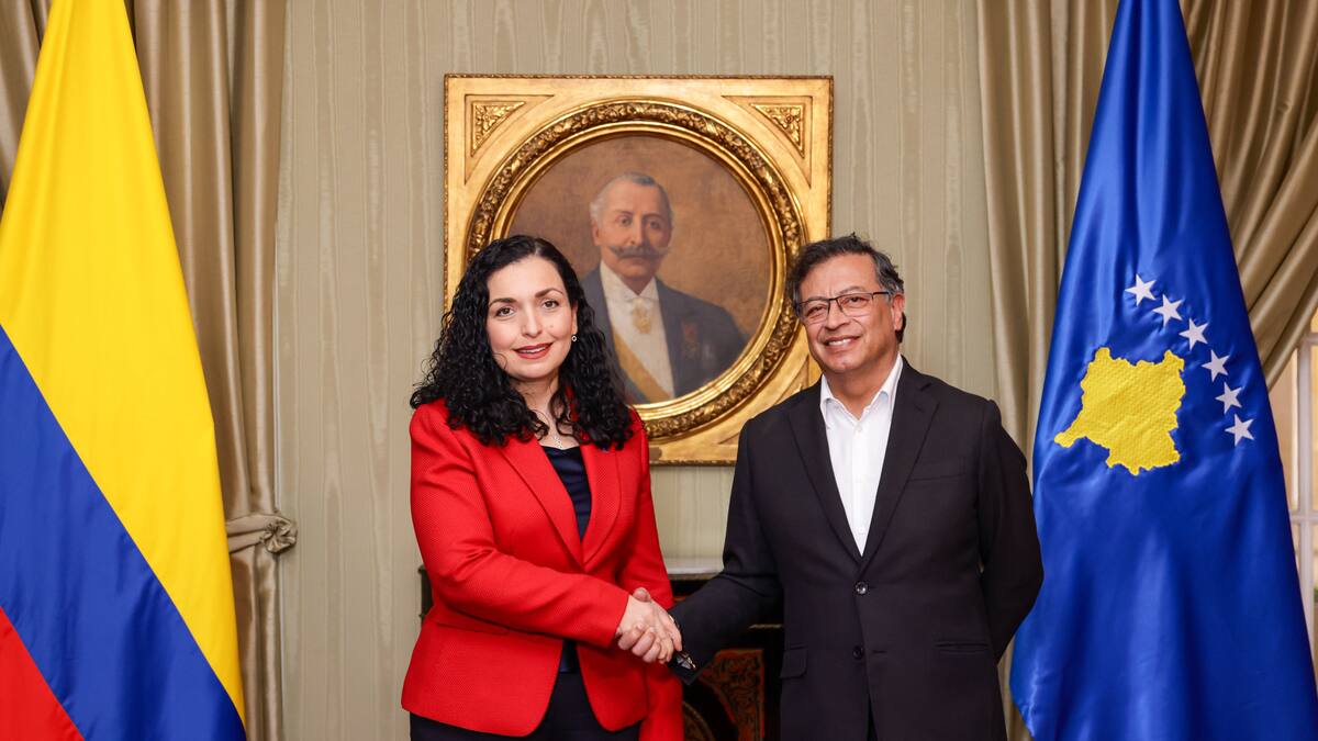 El presidente Gustavo Petro recibió este martes en la Casa de Nariño, sede del Ejecutivo, a su homóloga de Kosovo, Vjosa Osmani-Sadriu, una reunión en la que trataron temas de la agenda bilateral y que hace parte de una vista en la que la mandataria inaugura la embajada de su país en Bogotá.