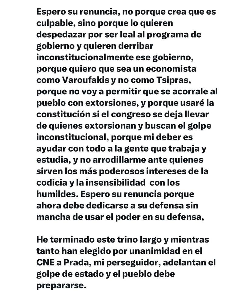 Además aseguró que el ministro debe separarse del cargo para dedicarse a su defensa “sin mancha de usar el poder en su defensa”.